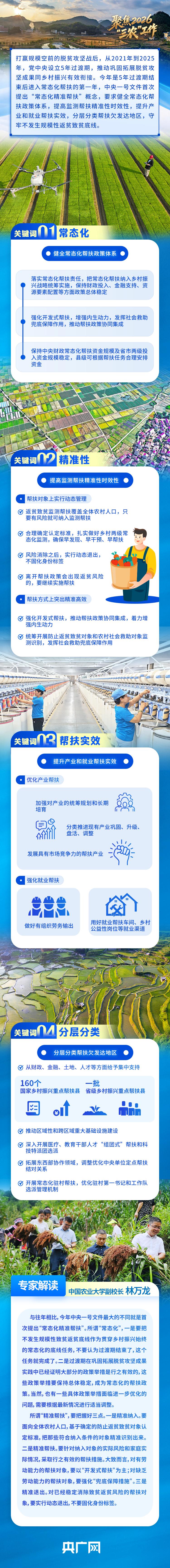 2月3日,立春节气前夕,《中共中央 国务院申博sunbet官网:锚定农业农村现代化 扎实推进乡村全面振兴的意见》向社会公布。这是党的十八大以来,中央连续出台的第14个指导“三农”工作的一号文件,也是“十五五”时期的首个中央一号文件。今年中央一号文件首次提出实施“常态化精准帮扶”,并对此作出系统性部署。如何理解“常态化”?怎样把“精准帮扶”落到实处?央广网约请相关专家进行解读。