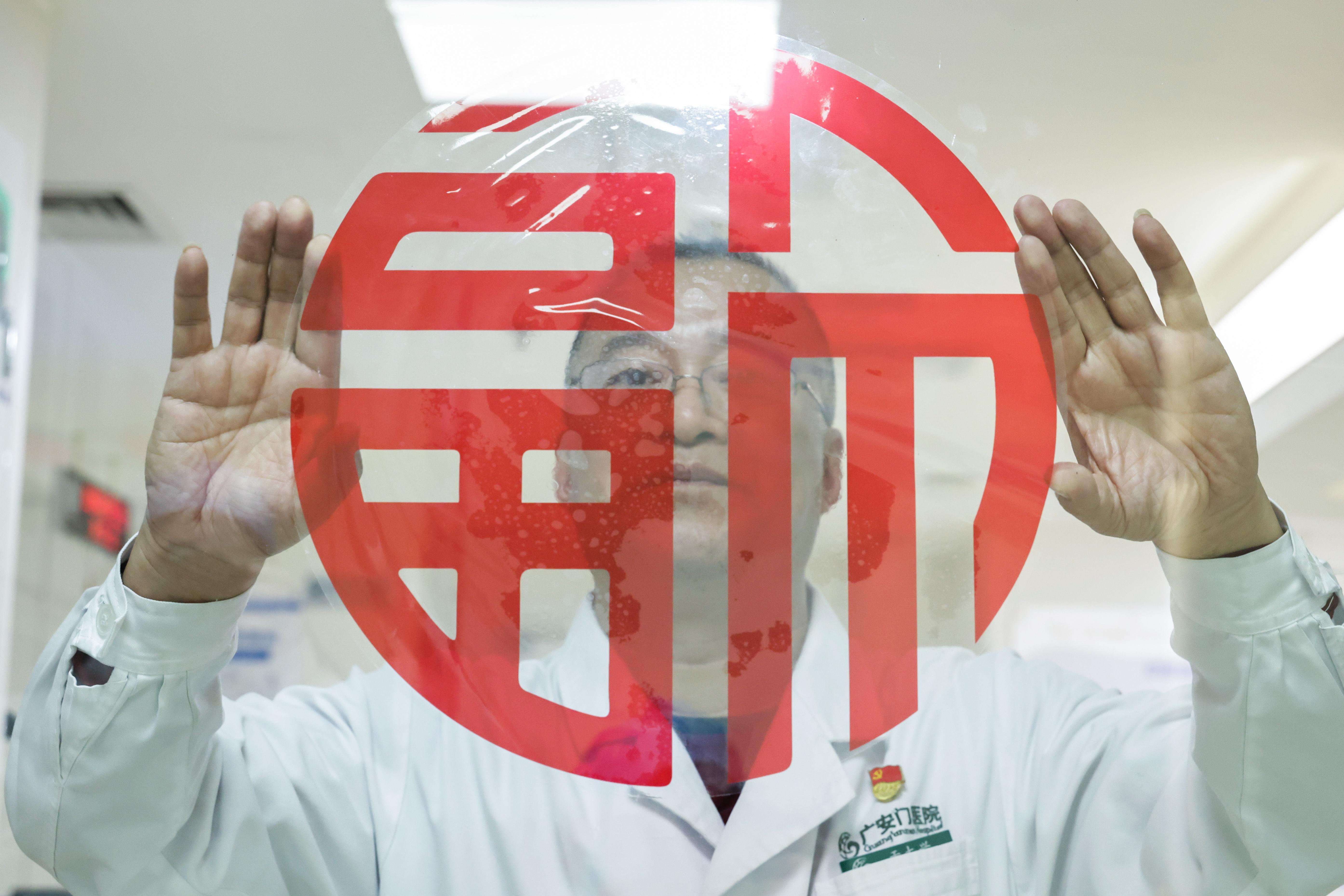 2月12日16时许,急诊科主任于大兴在急诊病房内贴上福字。